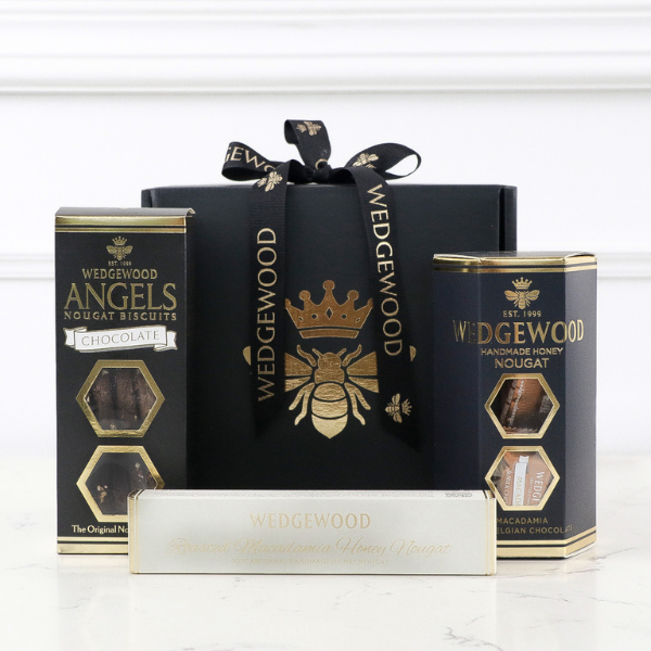 A Wedgewood Small Printed Hamper Box, 1x Angels Belgian Chocolate Nougat Biscuits, 1x Macadamia Nougat Boxed Bar, 1x Macadamia & Milk Chocolate Nougat Gift Box, ribbon and tissue paper, and a personalised card on request.